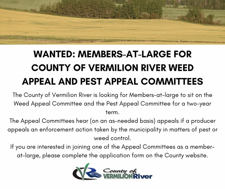 Back to News Listing Weed & Pest Appeal Committee Members Wanted July 15 2025 If you are interested in joining one of the Appeal Committees as a member-at-large, please complete the application form HERE. Prev Next