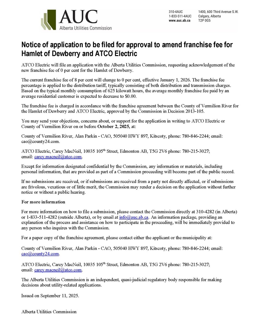 Back to News Listing Notice of Application to be Filed for Approval to Amend Franchise Fee for Dewberry & ATCO Electric September 11 2025 Prev Next